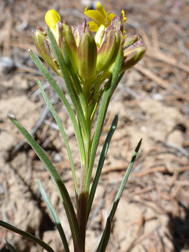 Flowers are formed of four oblong, reddish-yellow sepals, the opposite pairs slightly different in shape, and four clawed, oblanceolate, yellow petals, approximately equal in length - around a third of an inch. Petal tips are rounded. Fruits are ascending, narrow, straight and linear, up to 2.5 inches long.