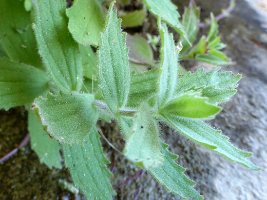 Erythranthe eastwoodiae, an uncommon species, is endemic to the Colorado Plateau, mostly in northern Arizona and southern Utah, growing in seeps and hanging gardens, often along canyons. Stems, leaves and calyces have a covering of spreading hairs. Leaves are relatively broad, lined by large teeth, mostly above the middle, and crossed by three or five palmate veins. The largest leaves are towards the top of the stem. Stems are spindly, usually climbing, prostrate or pendulous, hanging down from sloping rock faces.