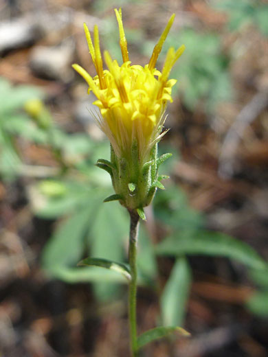 The narrow, cylindrical, rayless flowerheads of eucephalus breweri are formed of around ten to 20 yellow disc florets, which produce protruding yellow stamens and divided, yellow-brown styles when mature. Florets around the edge mature first. The green phyllaries are approximately equal in length, have pointed tips and a light tomentose hair covering, and tend to curve outwards, away from the involucre. Stems and leaves have a similar covering of hairs. Long white bristles protrude above the upper row of phyllaries. Flowerheads form small, open clusters. Stem and leaves are usually glandular. This species is found mostly in the Sierra Nevada, extending to the southern Cascade Range.