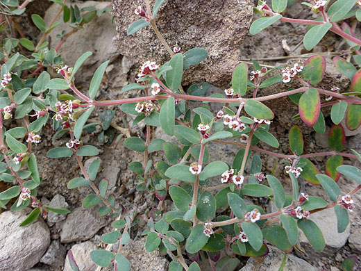 Leaves grow on short stalks, with a fused, triangular stipule at the attachment point. The branched, prostrate stems are hairless, and contain milky sap. Stems and leaf edges are usually colored red.