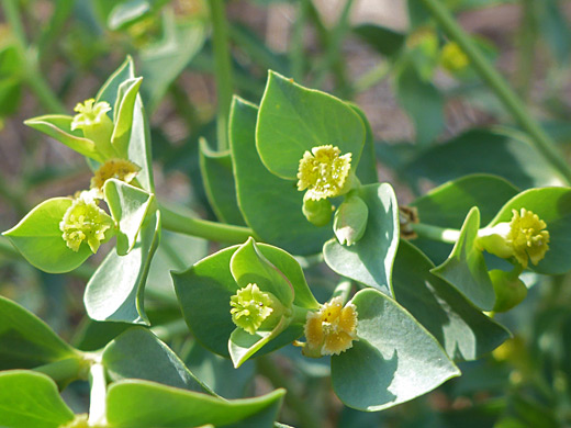 The uppermost leaves are arranged in a whorl of four or (usually) five; others are alternate. Leaves are hairless or finely pubescent, with entire edges. The inflorescence is a compound cluster with five (less often three or four)primary branches, each usually dividing into two, between one and four times; the upper divisions are subtended by an opposite pair of stalkless bracts, as are the terminal flowers. The four involucral glands are fan-shaped, notched along the flat upper edge, and they enclose a group of up to 20 staminate flowers of a smaller number of pistillate flowers, which have forked styles.