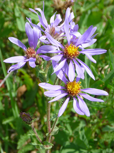 Stems of eurybia integrifolia branch sparingly to form small, narrow (not spreading) clusters of rather untidy-looking flowerheads composed of 10 to 20 lavender-purple ray florets and a center of small disc florets that are yellow at first becoming reddish or brown as they mature and elongate. The bell-shaped involucre beneath the flowerhead has small, pointed green bracts (purplish at the tips); both it and the stem are hairy and sticky (glandular). The plant grows a little taller than many similar aster species, over 2 feet. Its range is centered on the Great Basin, extending to the mountains at either side - from the Sierra Nevada to the Rockies.