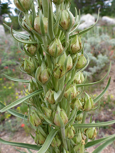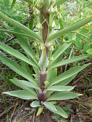 Frasera speciosa is one of the tallest non-shrublike flowering plants of the western mountains, sometimes exceeding six feet. The stout, rigid, unbranched stem and the long, clustered green leaves are generally hairless but may have a fine, soft hair covering. The lance-shaped stem leaves are arranged in whorls, of three to seven, and they have pointed tips; basal leaves are more oblanceolate in shape, generally with rounded tips.