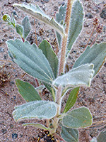 The yellow flowers of geraea canescens resemble those of several other sunflower-type species of the western deserts; identifying features include the stems, which are (usually) branched rather than single, and the leaves, which are thick, ovate with a somewhat elongated, pointed tip, and covered in fine hairs. Basal leaves are larger and have short stalks; those higher up the stem are smaller and stalkless (sessile).