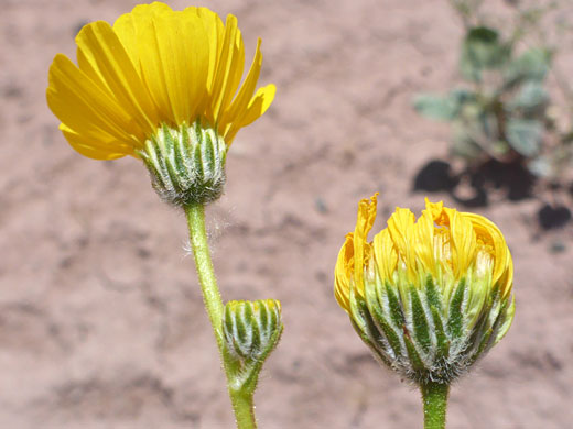 Flowers have between 10 and 21 bright yellow ray florets and several dozen central, orange-yellow disc florets which elongate when mature. Beneath the flowerheads are several rows of thin, linear, dark green phyllaries, each edged by dense, white hairs. The plant is common in some parts of the Mojave Desert, especially Death Valley.