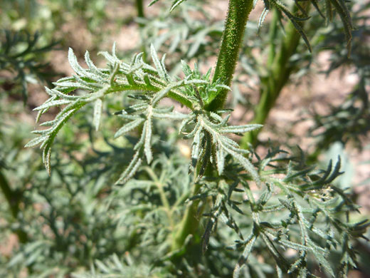Pinnately divided once or twice into pointed, linear lobes, around half an inch long