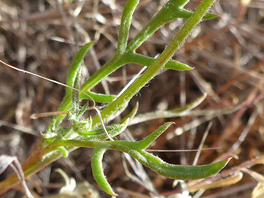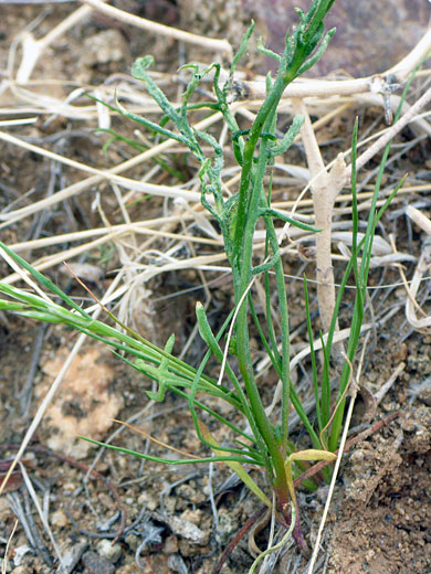 Gilia flavocincta is a low-growing plant, generally around one foot tall. Stems branch from the base and most of the way to the tip; they have a covering of cobwebby hairs below the middle, becoming mostly hairless and sometimes glandular towards the top. Leaves are once or twice pinnately lobed; lined by tiny leaflets which are broad at the base and have a small spike at the tip. Leaves also have a sparse hair covering, most strongly on the upper surfaces. They grow around the base and in small numbers along the stem, at alternate intervals.
