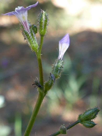Flowers form in small numbers at the top of the stems. Their most noticeable aspect are the dark glands, found all over the calyces and (less densely) the upper section of the pedicels. Calyces are green, purplish along the lobes, and less than a quarter of an inch in length. The five-lobed corolla is about twice as long, and colored dark purple at the base, yellow at the throat of the tube, and purple on the lobes (light towards the base, darker along the margin). The corolla lobes are held at 90 degrees to the tube. The five stamens have white filaments and light blue anthers, and project slightly beyond the corolla.