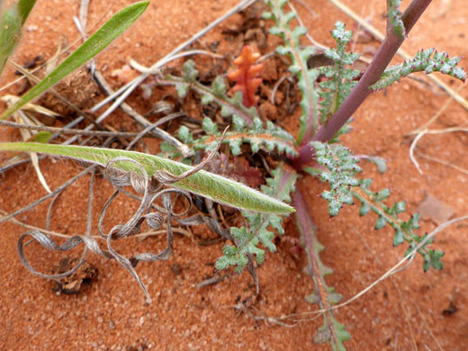 Gilia sinuata produces one or several stems, erect or spreading, which are hairless, colored light green with a greyish tint on the lower half. Leaves grow mostly at the base, also sparingly along the stems; like most gila species they are pinnately lobed, and (usually) lightly covered with short, cobweb-like hairs. Stem leaves are smaller, clasping, pointed at the apex, and less deeply lobed.