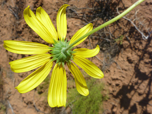 The common sunflower, helianthus annuus, is a familiar sight in fields and roadsides all across America. The large flowerheads can measure 5 inches across, with around 20 lightly grooved yellow ray florets surrounding a center of purplish-brown disc florets. The green phyllaries beneath the flower head are wide at the base but sharply pointed at the tip, and have a sparse covering of short hairs.