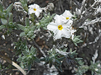 Heliotropium confertifolium is an uncommon species, found in scattered south Texas locations close to the Rio Grande, most widely in and around Big Bend National Park. Plants are low-growing perennials, with woody, branched stems bearing small but relatively thick leaves at alternate, closely-spaced intervals. Leaves and stems are covered with silky hairs, most lying against the surface, some pointing outwards.
