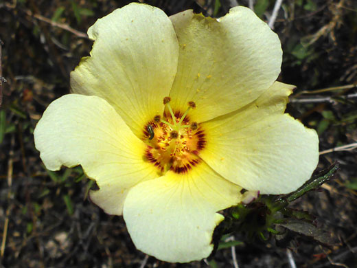 The white or pale yellow flowers of hibiscus coulteri are formed of five broad, fan-shaped, slightly overlapping petals colored deep red at the base. At the center are many small stamens and five dark anthers, while a ring of narrow, outwards-pointing green bracts is found underneath. Flowers are about 2 inches in diameter and occur singly at the end of thin stalks, on a lightly-branched, shrub-like plant that is quite inconspicuous when not in bloom. Stems are rigid and woody. Flowers can appear any time of year, following significant rainfall.