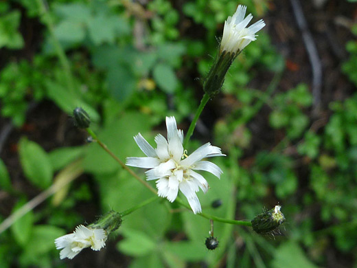 The inflorescence is an open, lightly branched cluster, the flowerheads consisting of 15 to 30 white, ray-like florets, each with four little notches along the flat tip. Underneath are 8 to 13 long, thin, dark green, pointed-tipped phyllaries, sparsely hairy, and glandular. Like the dandelion species that this plant resembles, the stems of white hawkweed contain a white, milky sap.