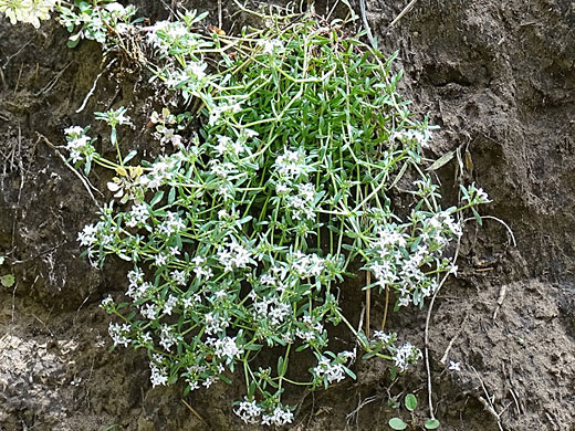 Houstonia wrightii is a low-growing, relatively inconspicuous plant, the slender stems usually only around six inches tall. Leaves are small, closely spaced and numerous; they are around half an inch long, pointed at the tip, linear in shape or slightly wider above the middle. Leaves are angled at about 90 degrees from the stem. Plants produce many stems, topped by compact, slightly elongated clusters of small flowers, colored white, pink or pale purple. Stems are woody around the base.