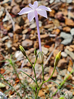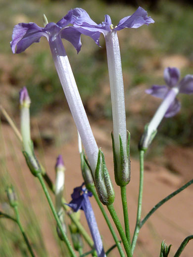 The long, very slender corolla tube opens out into five lobes, which have a little point at the tip. The lower end of the tube is held by five narrow, green sepals, purplish at the base. The plant branches readily from just above the ground. Leaves grow at intervals along the branches, but those around the base tend to have withered by the time flowering begins. Stems and leaves have a covering of very short hairs.