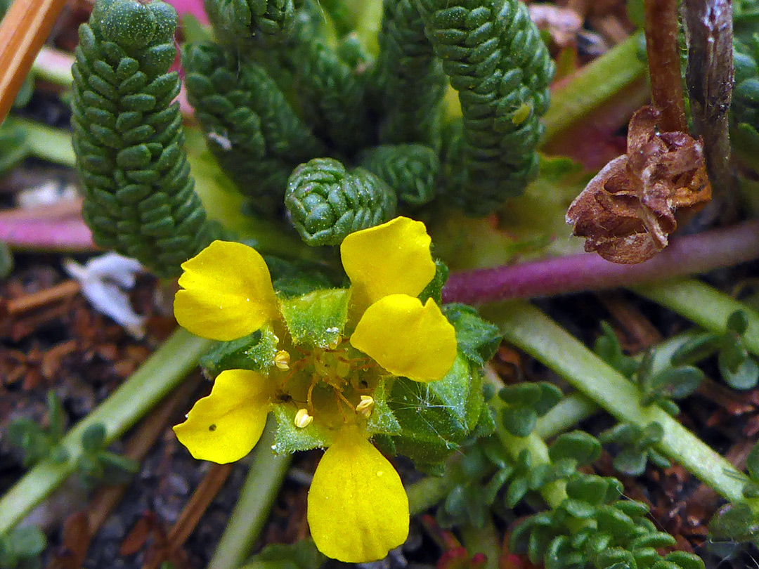 Flower and leaves - clubmoss mousetail (ivesia lycopodioides), Hilton Creek Lakes, Eastern Sierra, California