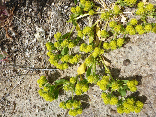 Lepidium flavum is one of the few yellow-flowered members of this genus; most are white. The branched stems may be up to 20 inches long, but usually grow along the ground, forming low mats. All plant parts are hairless. The fleshy leaves grow in a basal rosette and along the stem; those at the base are pinnately lobed (three to nine pairs, with entire margins), while stem leaves are simple, and shorter, with either entire or shallowly-toothed margins. Leaves are attached by short stalks.