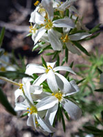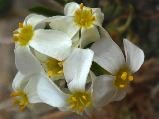 The inflorescence is an open cluster of a small number of flowers, subtended by leaf-like bracts. Calyces, around a third of an inch long, are divided almost to the base into five narrow, tapering, equal-sized lobes, while the slightly longer corollas have a yellow tube, narrowly funnel-shaped, and five white lobes, spreading to slightly reflexed. The five stamens are exserted, and all are attached at the same level.