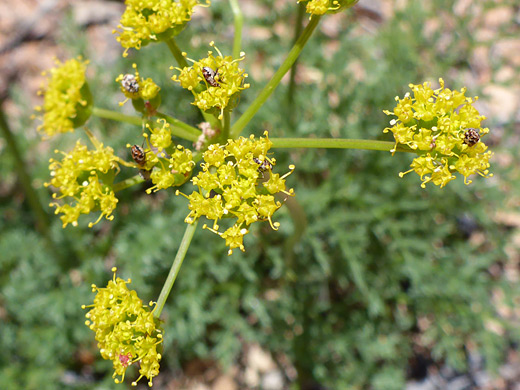 Lomatium scabrum is an uncommon species, found mostly in far southwest Utah and in adjacent areas of Nevada, inhabiting open, rocky places in semi-desert habitats. Plants produce relatively large and numerous bright green leaves, finely divided several times into flat, narrow, pointed leaflets. Leafless flower stalks rise above, growing upwards and at an angle, topped by bractless, compound umbels, typically of 10 to 20 rays, the individual clusters subtended by a few narrow, lobed bractlets. The small, five-petaled flowers are greenish yellow, with five exserted stamens. Fruits are bright green, flattened elliptical pods, lacking prominent ridges.