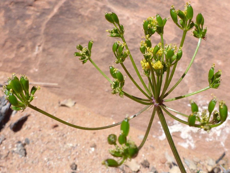 Clusters of green fruits; lomatium scabrum, Gunlock State Park, Utah