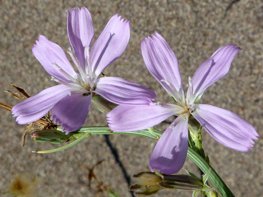 The plant inhabits arid, often sandy locations at low to moderate elevations, and can produce up to 50 flowerheads. The toothed pink ray florets (usually five) are about half an inch long, pale pink to lavender to almost white in color, and each has a stamen protruding from the base. The involucre is narrow and somewhat elongated, with 5 to 7 linear phyllaries, which lack appendages, unlike some similar species.