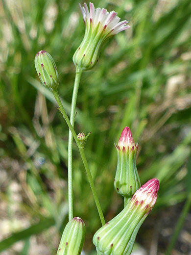 Flowerheads have a bell-shaped involucre surrounded by 16 to 20 linear phyllaries, colored light green, whitish at the margins and purple at the top. At the base of the involucre are 5 to 12 much shorter bractlets, also purple-tipped. The 19 to 67 disc florets are pale yellow, slightly darker towards the center. The outer portion of the undersurface of the florets is often purplish.