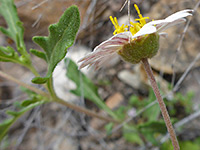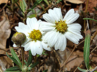 The large white flowers of melampodium leucanthum have 8, 9 or 10 ray petals around a yellow, protruding center of many tiny disc florets, and they bloom at the end of lightly-branched stems between 1 and 2 feet in height. The white petals overlap about half way along their length; they are toothed at the tip and curve back slightly at the end. When fully open, the petals bend back a little below the plane. Leaves are narrow, with blunt-pointed tips and a prominent, lighter-colored midvein. The plant grows in hot, arid locations, from the Sonoran Desert of south Arizona east to the southern Great Plains.