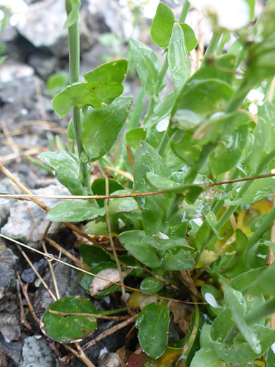 Noccaea fendleri produces one stem or several, growing upwards or at an angle, branching (if at all) above the middle. Stems vary greatly in height, from just a couple of inches in high Alpine regions to over a foot in sheltered, well-watered canyons. Leaves grow at the base, where they are variously shaped - linear, oblong, spatulate or oblanceolate, and along the stem, where they are more generally ovate, about half as long, and clasping. Leaf margins may be entire or finely toothed.
