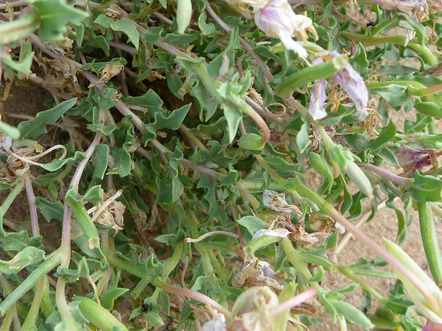 Curly-edged leaves of oenothera neomexicana (New Mexico evening primrose) beside the road to Angel Peak Scenic Area, New Mexico