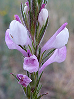 As the species name suggests, flowers of orthocarpus purpureoalbus are bicolored, a mix of purple and white; the corolla tube is pinkish purple, while the uppermost of the two lips is darker purple; the lip is narrow and straight, projecting outwards, and terminating in a small spike. The much wider lower lip is mostly white, and expanded to form a pouch. All corolla parts become purple as they mature and then wither. Flowers form in relatively small numbers towards the top of the stem, blooming gradually higher up the stem as the season progresses. Flowers are subtended by narrow, lobed bracts, similar to the leaves but shorter.