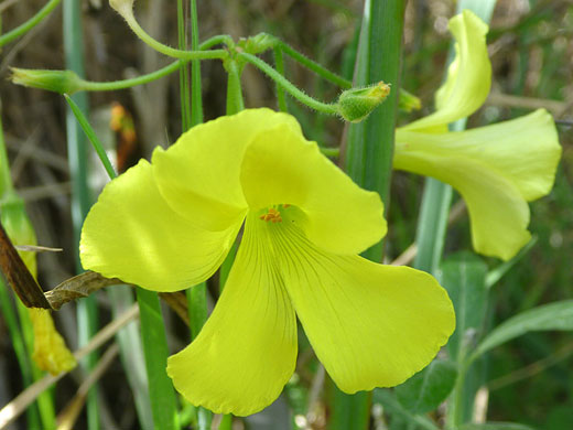 Native to South Africa, oxalis pes-caprae (Bermuda buttercup) has been established in parts of south Arizona and in California, mostly along the coast. It blooms in winter and early summer; flowers are initially tubular, about one inch long, composed of five partly fused sepals which later open out fully, curving back a little. Sepals are crossed by fine green radial veins which become more prominent towards the cup-shaped center; this holds a group of ten stamens and a pistil. Flowers form as a loose cluster at the end of a lightly hairy stalk, often rising well above the divided, heart-shaped leaves. The plant is classed as a noxious weed in many areas, difficult to eradicate because it spreads via roots and bulbs.