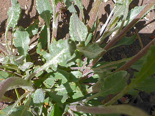 Packera neomexicana is a relatively low-growing species, less than 2 feet tall, producing between one and five stems, closely spaced, which have leaves mostly around the base. Stems are often purplish near the ground, green higher up, and they have a thin covering of tomentose hairs. Basal leaves grow on stalks (petioles) which may also be purplish, and hairy. The base of the leaf blades taper gradually to the stalk. Leaf margins may be almost entire, but more usually have teeth, coarse or fine. Stem leaves are much smaller, alternately arranged, and few in number. The uppermost leaves are sessile, and have entire edges.