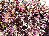 The inflorescence is subtended by green or reddish bracts, generally shorter than the corollas. Flowers have a hairy, four-lobed calyx, less than one inch long, and a hairless, two-lipped corolla, mostly colored white to pale yellow except for the tips which are pink to purple. The upper lip is slightly longer than the lower lip, and the corolla is club-shaped. Yellow anthers project a little way above the lobes.