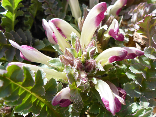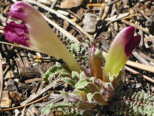 Pedicularis centranthera is a distinctive plant, forming spreading mats of compound leaves and relatively large, bright flowers, different to most members of this genus which grow upright. Stems are short and hairless, while the fern-like leaves are basal, divided into small leaflets, and are always longer than the inflorescence. Leaflet edges are variously toothed, lobed or wrinkled, and the margins often have a red or purple tint.