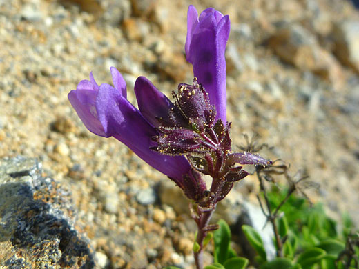 One of the low growing penstemon species, penstemon davidsonii has a thick mat of small, oval leaves growing along short stems, woody at the base, and produces large lavender flowers in summer. These grow from the tip of stalks which also bear a few leaves, even smaller, and have the familiar structure for this genus of a five-lobed tubular corolla (two lobes curved back upwards and three downwards), with five stamens, one (the staminode) infertile and hairy. Sepals are purplish, and covered with short glandular hairs.
