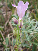 Leaves of penstemon linarioides are quite distinctive, being short, narrow and linear, topped by a small spike, and angled upwards, at 45 degrees or less from the stem. Leaves grow all along the stem; those on the upper portion subtend the flower clusters. Stems are ascending to erect. Leaves have a light covering of fine, short hairs.