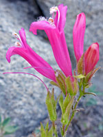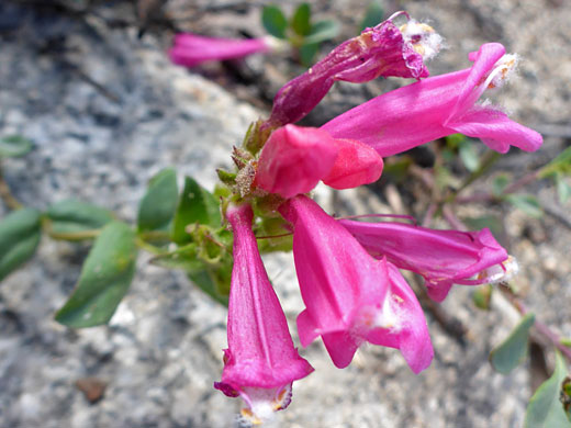 The numerous pink flowers of penstemon newberryi grow at the top of short reddish stalks rising a few inches above the leaf clusters, and often point sideways, all in the same direction. Individual flowers are just over an inch in length, tubular at the base, with five small lobes at the tip, two curved back upwards and three below; all have an inner coating of short white hairs. There are five stamens inside. Sepals are around a third as long as the tube and, like the pedicels and upper stem, have a covering of glandular hairs.