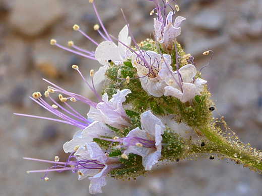 phacelia integrifolia flowers is subtly different to similar species; pale lavender pink, lighter when withered, and contrasting with the dark purple of the stamen filaments and (usually) of the sepals. The stamens are exserted beyond the corolla lobes, and are topped by blue or purple anthers. The edges of the corolla lobes are fringed, or minutely toothed. The ovate or lanceolate sepals have a covering of spreading hairs of different lengths.