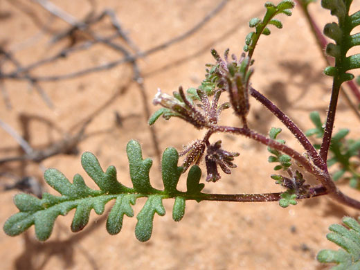 Although small and unobtrusive, phacelia ivesiana is an easily identified species on account of its diminutive white flowers, reddish stems and pinnate leaves. Stems branch readily, from the base and, like the leaves, have a sparse covering of sticky, glandular hairs; plants inhabit sandy environments, and grains of sand often adhere to them. Lateral branches are often longer than the central stem. Leaves are approximately equal in size all along the stems, are attached by short stalks, and are pinnately divided into rounded lobes. Leaf edges are ciliate.