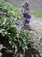 Most leaves are basal, divided once or twice into small lobes, and they also have a dense hair covering, giving the plant a silky, silvery lustre. The plant inhabits a range of elevations but is most frequently observed in higher regions. This is a relatively uncommon species.
