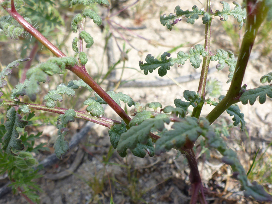 Sparsely hairy stem and leaves; phacelia tanacetifolia, Hagen Canyon, Red Rock Canyon State Park, California
