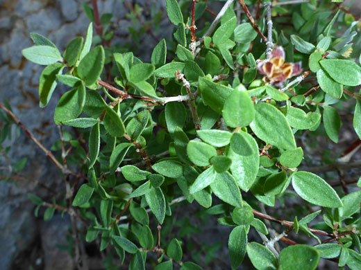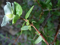 Philadelphus microphyllus is a small shrub, typically 2 to 4 feet high, with thin, arching branches bearing grey and/or reddish brown bark, and usually covered with appressed hairs, often red at the base. Leaves are attached by very short stalks, and are greyish-green underneath, due to a covering of short hairs, spreading or appressed, and brighter green on top, where hairs are more sparse.