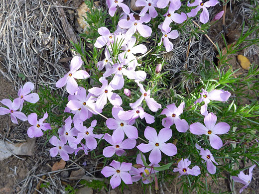 The five, pale pink or lavender (less often white) petals of phlox austromontana flowers are mostly separate, not overlapping towards the base, and are centered on a small tube (darker on the inside) containing yellow-tipped stamens. Each flower is about one inch in diameter. The petals, or corolla lobes, are generally rounded at the tips. Buds have a spiral arrangement of the folded petals.