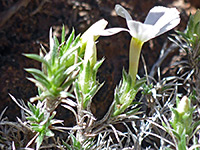 A single stalkless flower is produced from the tip of each stem, formed of a short, hairy, green calyx and a narrowly tubular, yellowish-green corolla (around half an inch in length) that opens to five spreading, white or pale pink lobes. The upper edges of the lobes are slightly uneven. Flower color becomes lighter with age. The anthers are yellow, and not exserted.