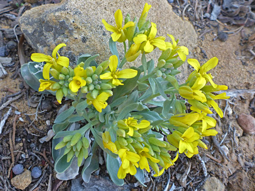 Physaria chambersii is a small plant, its flowers growing on short stems that recline close to the ground. Basal leaves, below the flower stalks, are quite large, ovate or spoon-shaped, while those at the center of the rosette and along the stalks are much smaller. The small yellow flowers have four petals at right angles, with a small cluster of stamens in the middle, protruding slightly. The common name twinpod describes the fruit, which is divided into two sections, each containing four seeds.