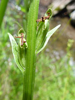 Stems are tall, up to 4 feet, and rigid. Leaves (between five and nine) are mostly at or near the base, not higher up the stem. The inflorescence occupies up to 2 feet at the top of the stem, with alternate flowers that are relatively well-separated. Sepals are green while petals are distinctly yellowish. The lower petal, positioned downwards, is lanceolate in shape, noticeably wider at the base than towards the tip, while the spur is narrowly club-shaped, and varies in relative length from 0.8 to 1.4 times the lip. The lip is longer than the two lateral sepals. Beneath each flower is a narrow bract, curving upwards.