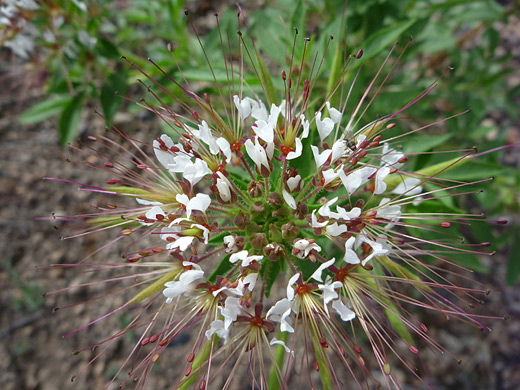 Polanisia dodecandra produces spherical clusters of around 20 white flowers, each consisting of four petals, wide (and notched) at the tip, but tapering to a narrow stalk. At the base of the petals are four smaller, purple sepals. The inflorescence is made quite striking by the very long stamens, 6 to 20 per flowerhead, which radiate out in all directions. They are colored various shades of purple and pink, and have different lengths. The average number of stamens is 12, hence the species name dodecandra.