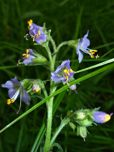 The inflorescence is an open, elongated cluster, containing between ten and 35 flowers, attached by very short stalks. Flowers are formed of a hairy calyx with five spreading lobes, and a bell-shaped, blue-purple corolla. The calyx tube is shorter than the calyx lobes. The five stamens have white filaments and orange anthers, and are about as long as the corolla lobes; the pistil is somewhat longer. Flowers are spreading to pendent.