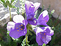 The purple, pale blue or (less often) white lowers are sessile, or attached by very short stalks. They are somewhat longer (up to one inch) than they are wide; formed of five overlapping, rounded, oblanceolate lobes around a group of five stamens with purple filaments and yellow anthers, and a purple pistil topped by three stigmas. Beneath the petal is a five-lobed, glandular calyx, the lobes shorter than the tube.