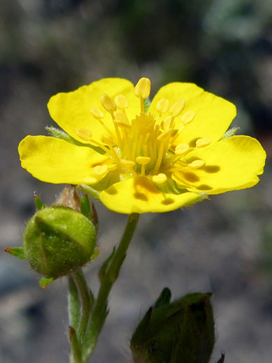 Flowers form sparse, flat-topped clusters, branching from the upper part of the stem. Flowers are centered on a ring of yellow stamens topped by heart-shaped anthers, around a group of thin, greenish-yellow styles. The flat-tipped yellow petals are generally touching or slightly overlapping, and about 0.4 inches in length. The green sepals are pointed, somewhat curved, and hairy.